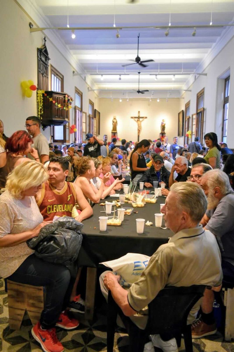 Luego, todos fueron invitados a pasar al salón, donde se compartió la cena festiva. En esta ocasión acompañaron más de 300 personas en situación de vulnerabilidad y de calle, junto a más de 45 voluntarios y voluntarias que, con gran alegría, ofrecieron su servicio fraterno.